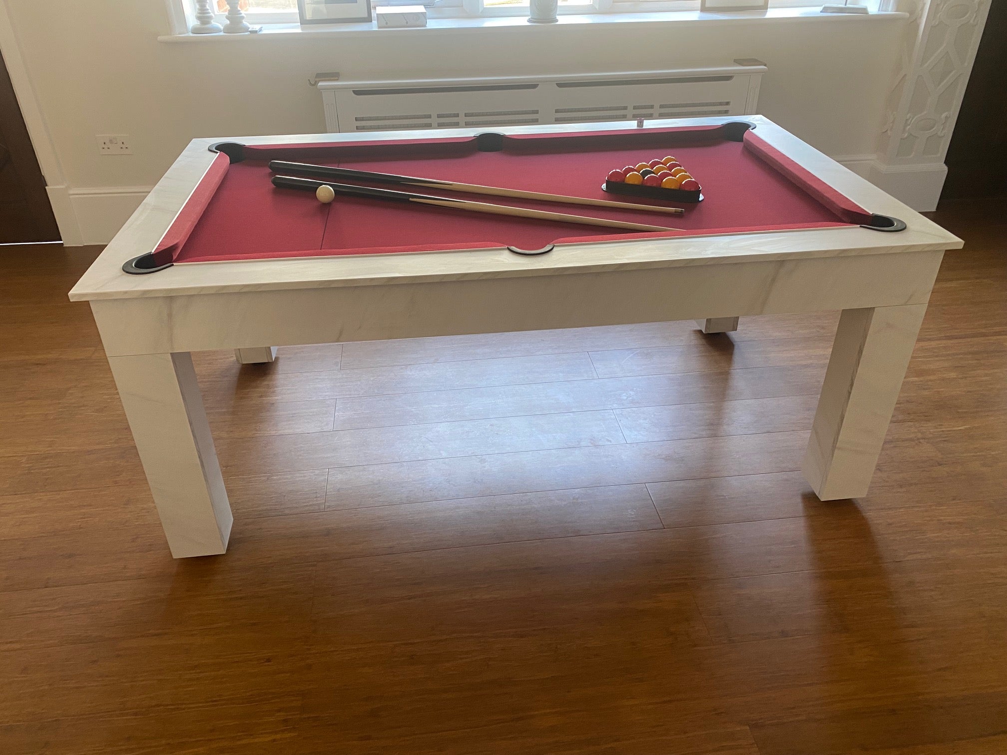 Quick drop quiet pockets, ensure there's little noise when the table is in use later in an evening. The Ball collection is accessed by a discreet drop down door at one end. There are no return 'Holes' or those giveaway pool table style chrome corners to 'spoil' your dining table!