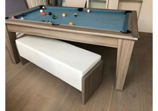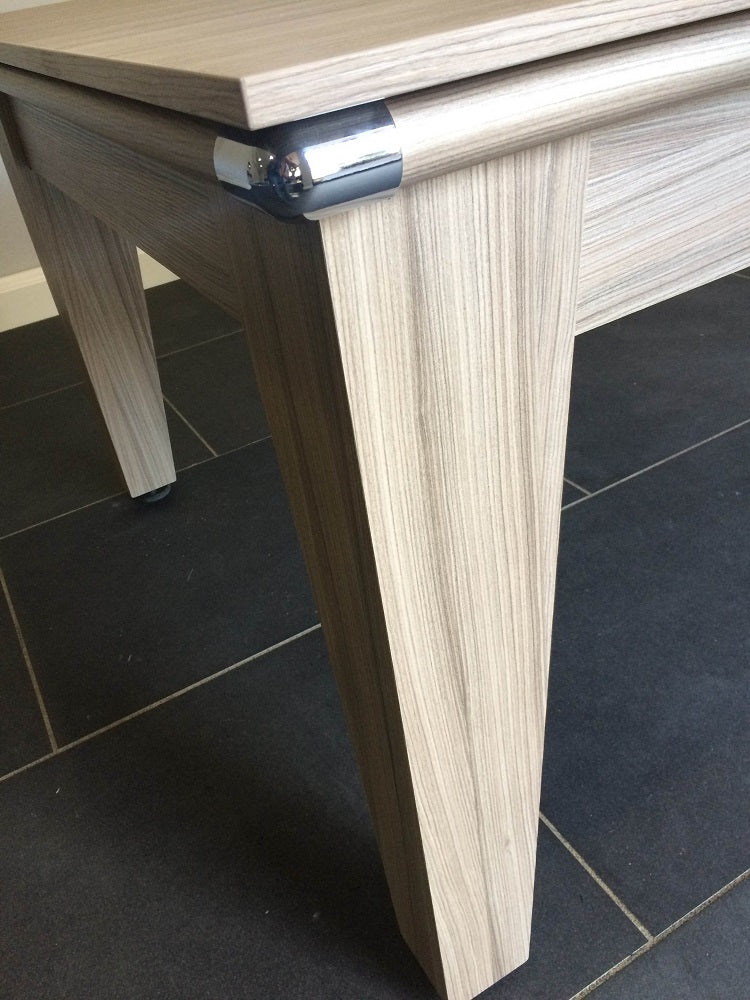 The Supreme Classic Diner is available in a Driftwood finishes. It, is a modern style dining table which easily converts into an English pool table. With tapered legs, invisible levelers, a two piece dining top and complimented by the chrome corner plates, this is a great addition to any home environment.