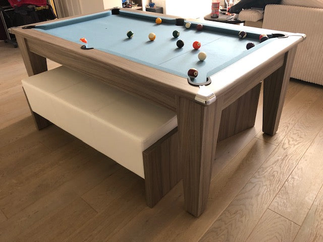 The table is available in two sizes. English Pool table sizes are based on the tables outside measurements.