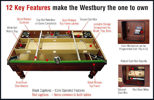 We have a 6' x 3' (outside measurements) reconditioned Westbury This is a fully reconditioned slate bed pool table with a Walnut laminate exterior finish and full turned legs with levelers. The playing area has been returned to tournament standard and the table is supplied with